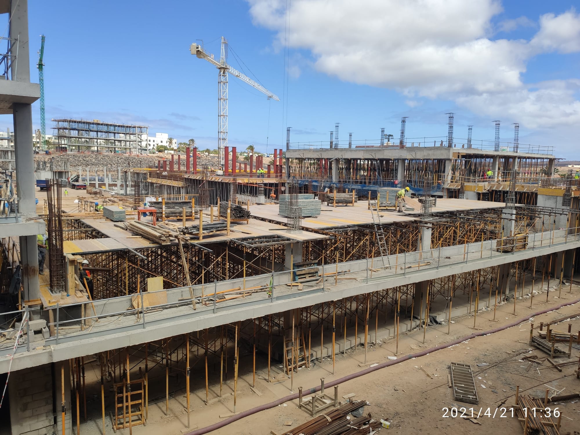 Structural work for the execution of a hotel in Lanzarote made up of 17 buildings of different geometries, heights, type of slab and dimensions. The thicknesses vary from 25 to 40 cm, and a large part of the work on falsework must be done as they have free heights greater than 6 meters. In stair cores, oval walls stand out.